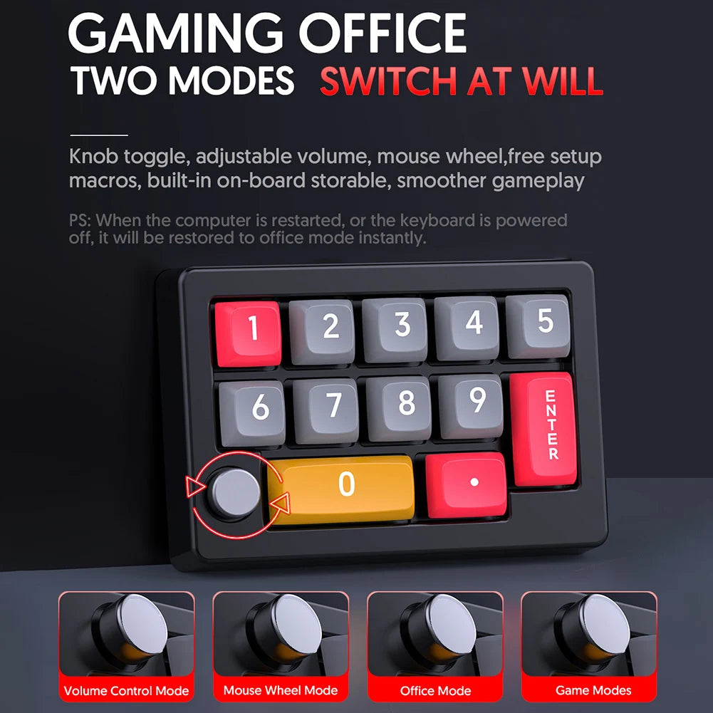 Feature: 1.Vibrant Lighting Effects: Featuring 12 dazzling lighting effects, the mini gaming keyboard offers freedom to switch between modes, enhancing your gaming experience with colorful displays and captivating ambiance. 2.Detachable Cable Design: The mechanical gaming keyboard is designed for portability and easy operation, allowing for seamless plug-and-play connectivity without hassle. 3.Customizable Macro Keys: Multiple macro programming keypad enables users to set key functions based on personal preferences and adjust lighting and volume freely for a tailor-made immersive gaming session. 4.Rotary Mode Switch Key: Easily adjust volume, mouse wheel, or set macros with the gaming mechanical keyboard's knob mode switch key. Built-in onboard memory stores your settings. 5.Enhanced Portability: With a detachable number keyboard design, the device ensures easy portability while maintaining efficient functionality, perfect for dynamic gaming environments. Specification: Origin: Mainland China Cable length: 1.8M Hot plug: Support Macro programming: Support Axis: Mechanical axis/red axis Number of cases: 13 (including knob keys) Lighting: 12 types Keyboard size: 127*87*29mm Keyboard weight: 120±5g Product size: 127.00x87.00x29.00mm Product size: 5x3.43x1.14inch