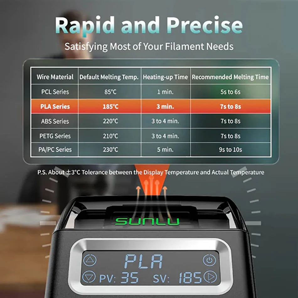 SUNLU Filament Connector FC01 rapidly heats up to 185°C in about 3 minutes, improving efficiency and saving time. Temperature accuracy within ±3°C ensures reliable and consistent operation for a stable and efficient experience.