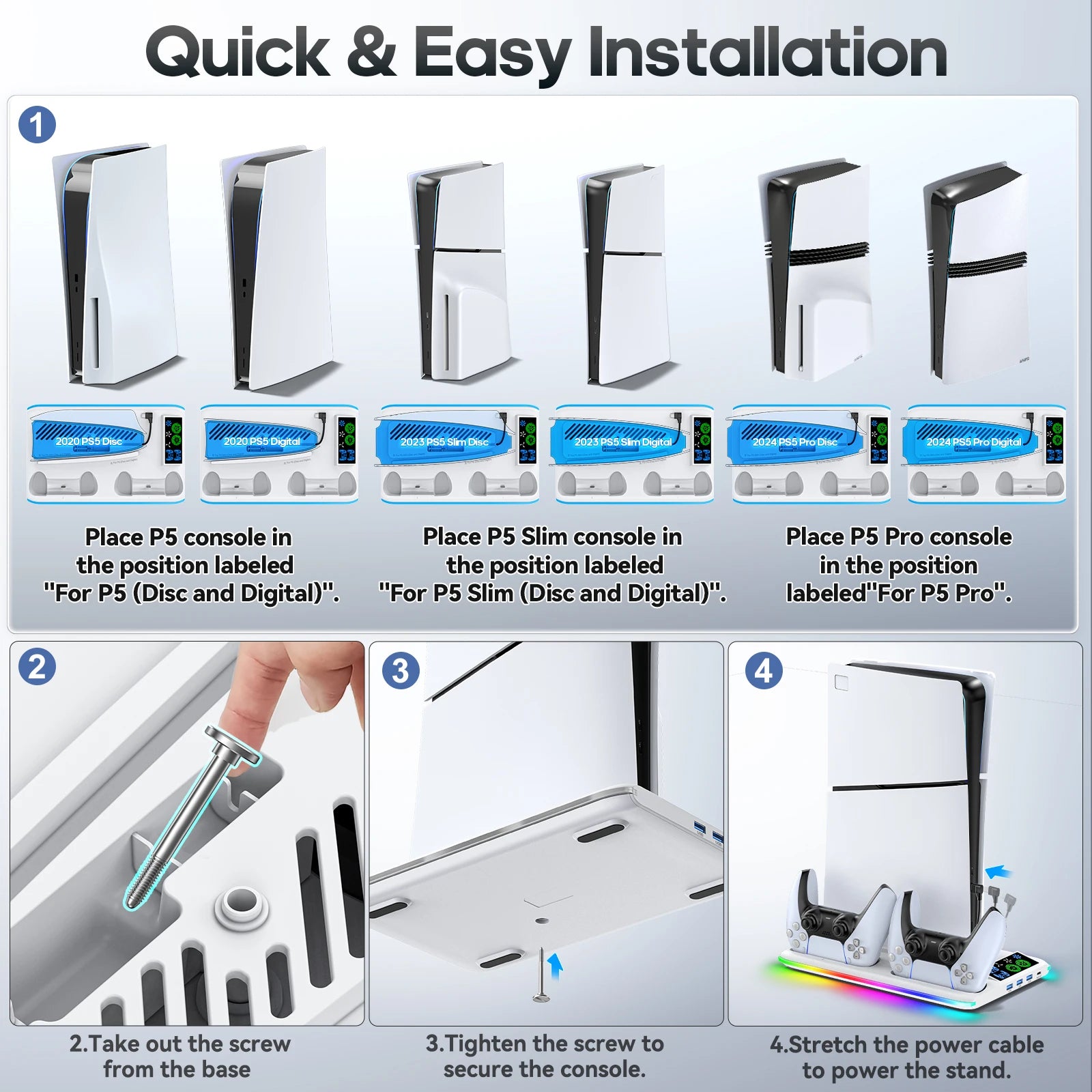 for PS5/PS5 Slim/PS5 Pro Stand with Headphone Hook Cooling Stand with Controller Charging Station for PS5 With 3 Levels Cooling Fan