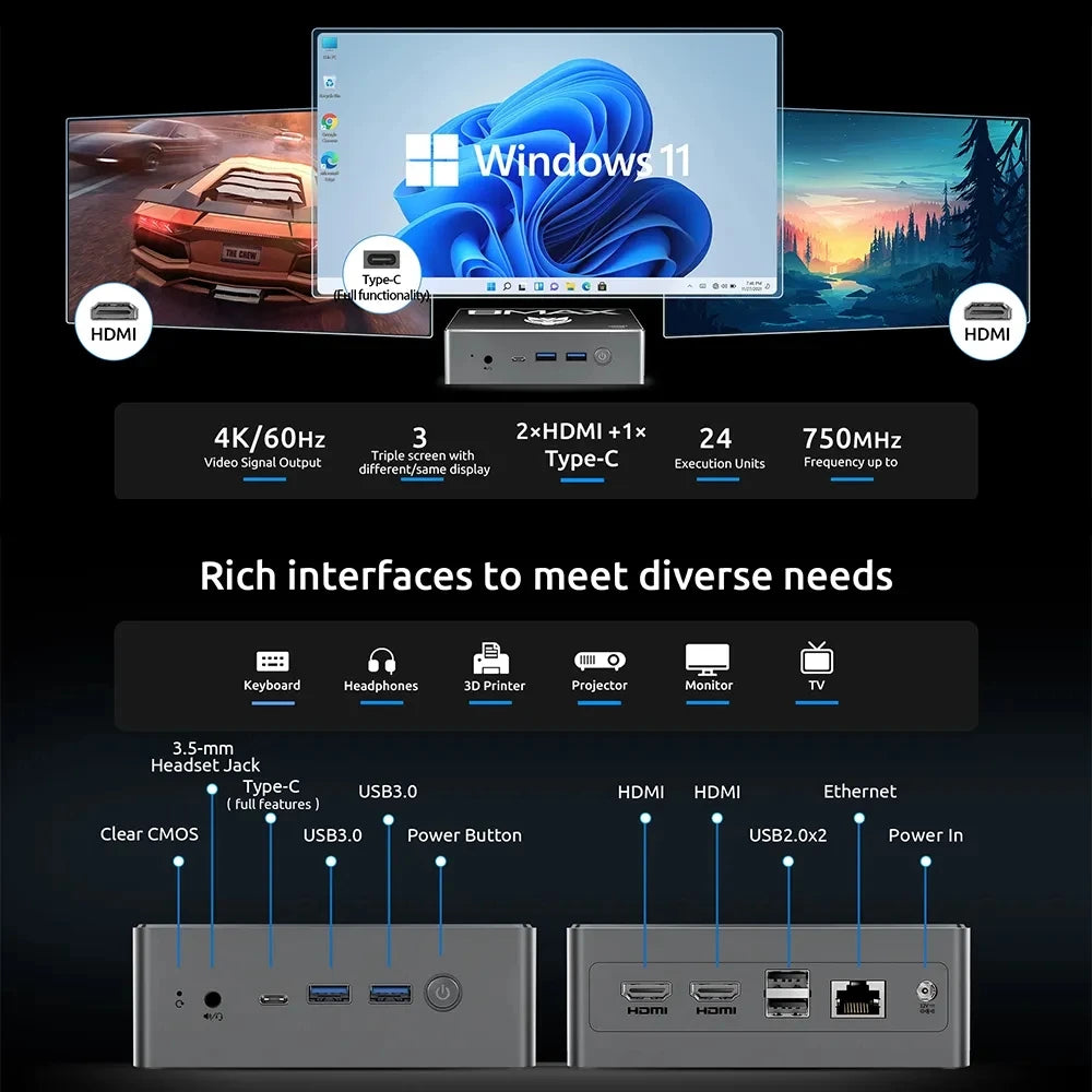 Mini PC Windows 11 PC Intel N100 16GB DDR4 512GB SSD 2*HDMI 1*Type-C Supports 4K@60Hz 750MHz Intel UHD Graphics