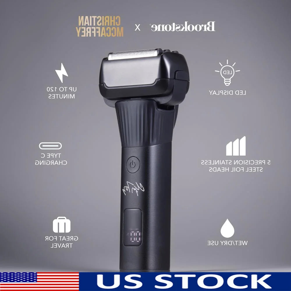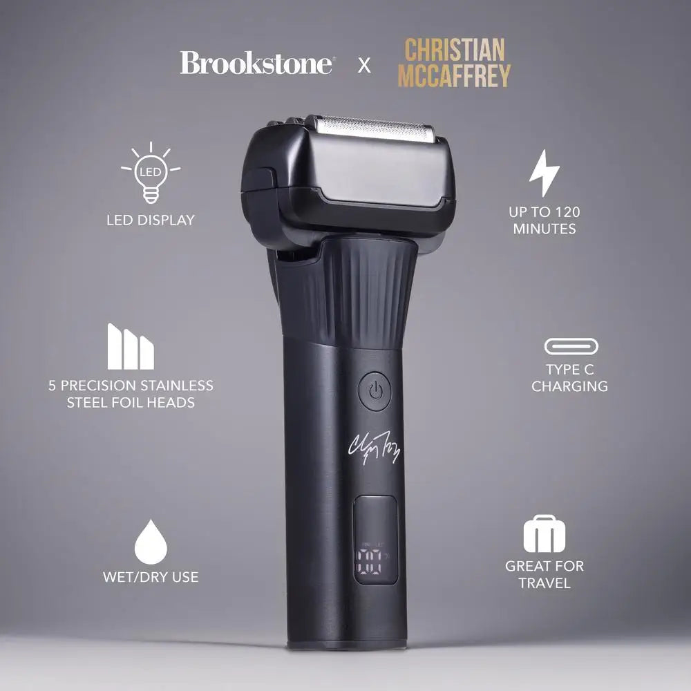 All-Pro Running Back Christian McCaffrey Special Edition with his signature Men's Electric shaver is Cordless and rechargeable with an LED that shows battery capacity Brookstone 5 Precision stainless steel blades Built-in Pop up trimmer for sideburns IPX6 waterproof for wet or dry shaving Weight 0. 62 lbs