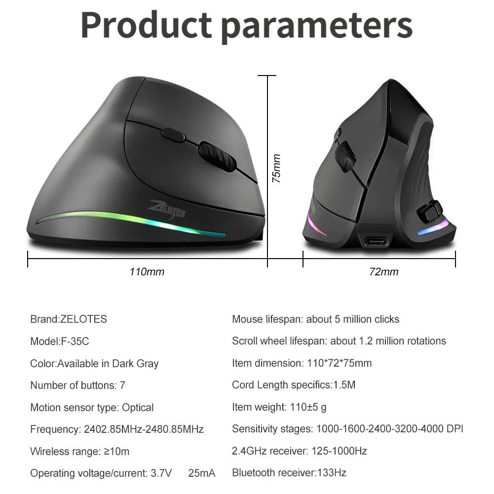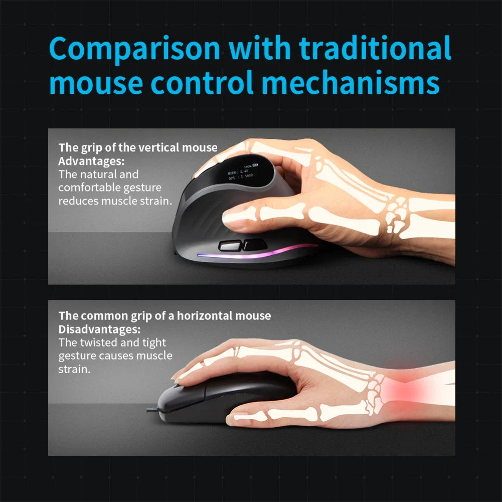 Feature: 1. Informative Display: The Vertical Wireless Mouse features a built-in display that shows the current connection mode, battery level, and DPI settings, keeping you informed at a glance. 2. Tri-Mode Connectivity: This Wireless Mouse connects via cable, USB receiver, and Bluetooth, with three Bluetooth channels. It can simultaneously connect to two devices (one via USB, one via Bluetooth) and switch between them effortlessly. 3. Rechargeable Battery: The Ergonomic Mouse includes an 800mAh rechargeable battery with a USB charging cable, allowing you to use the mouse while charging, ensuring uninterrupted productivity. 4. Ergonomic Design: The Vertical Mouse is designed to keep your hand naturally relaxed, reducing strain on your arm and wrist. It's perfect for long hours of computer use, accommodating various hand sizes comfortably. 5. Adjustable DPI and Broad Compatibility: The Wireless Vertical Ergonomic Optical Mouse offers 5 DPI settings (1000/1600/2400/3200/4000) for precision control. Its compatible with Win11, Win10, Win8, Win7, OS, Chrome OS, and for Android 5.0 or later. Specification: Origin: Mainland China Color: dark gray Connection method with computer: wired, 2.4G, Bluetooth-Compatible connection Number of keys: 7 keys Tracking system: optical Frequency: 2402.85MHz-2480.85MHz Effective distance: ≥10m Working voltage/current: 3.7V25mA Key life: approximately 5 million times Roller life: approximately 1.2 million revolutions 2.4GHz report rate: 125Hz-1000Hz Resolution: 1000-1600-2400-3200-4000 DPI Bluetooth-Compatible report rate: 133Hz Product size: 110.00x75.00x72.00mm Product size: 4.33x2.95x2.83inch Note: This mouse has programming function, and the driver can be downloaded from the official website. However, driver programming needs to be operated in wired or 2.4G state, and Bluetooth-Compatible does not support programming.