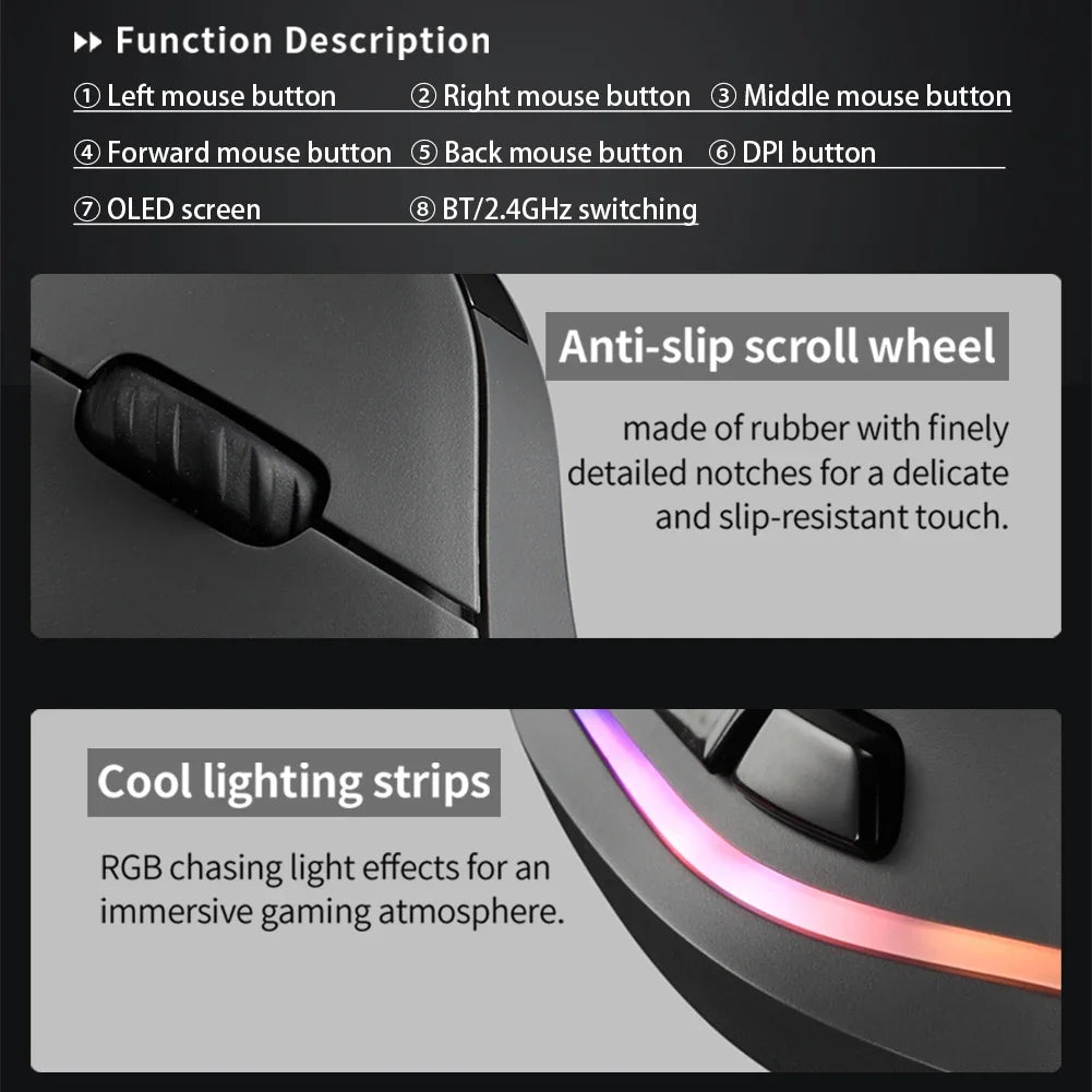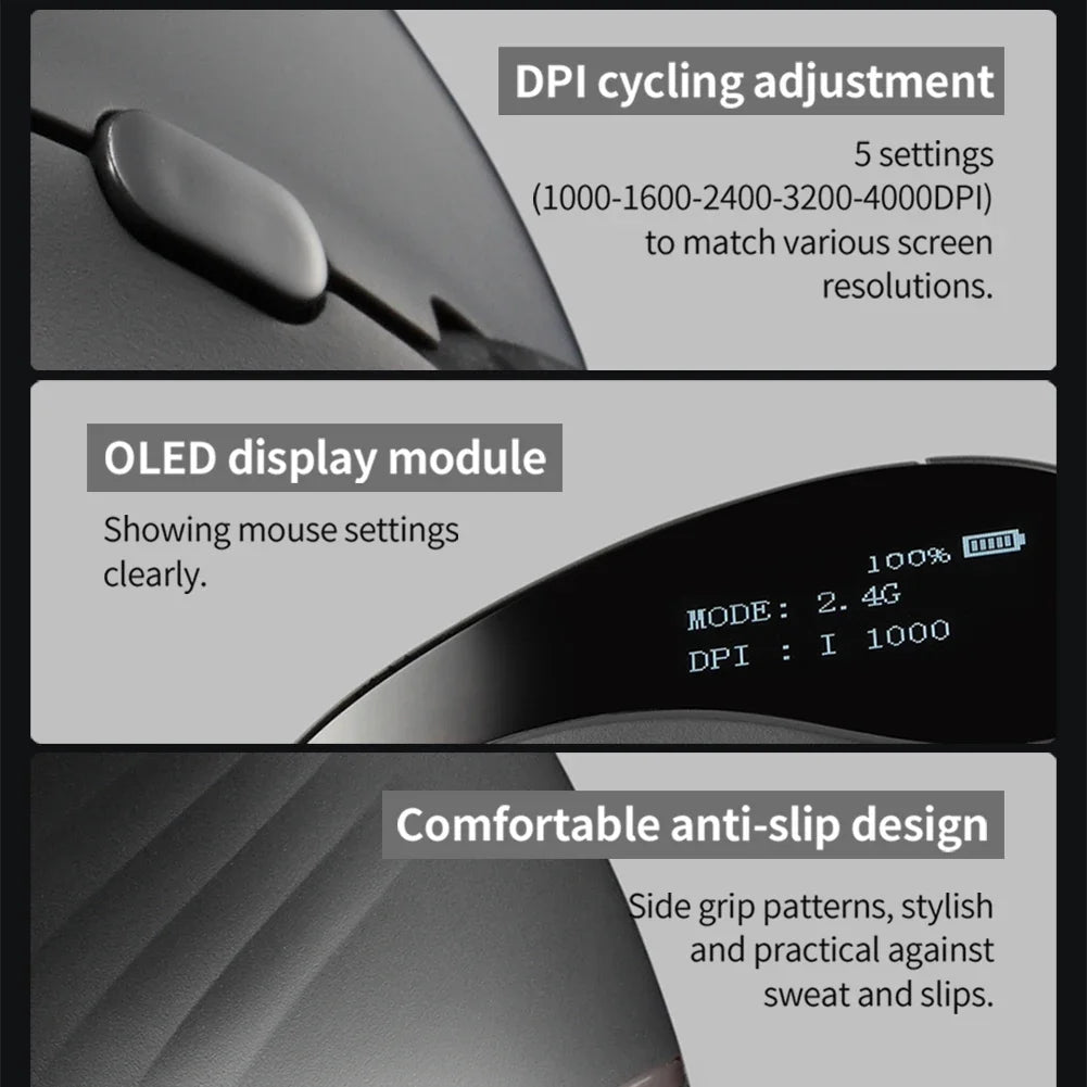 Feature: 1. Informative Display: The Vertical Wireless Mouse features a built-in display that shows the current connection mode, battery level, and DPI settings, keeping you informed at a glance. 2. Tri-Mode Connectivity: This Wireless Mouse connects via cable, USB receiver, and Bluetooth, with three Bluetooth channels. It can simultaneously connect to two devices (one via USB, one via Bluetooth) and switch between them effortlessly. 3. Rechargeable Battery: The Ergonomic Mouse includes an 800mAh rechargeable battery with a USB charging cable, allowing you to use the mouse while charging, ensuring uninterrupted productivity. 4. Ergonomic Design: The Vertical Mouse is designed to keep your hand naturally relaxed, reducing strain on your arm and wrist. It's perfect for long hours of computer use, accommodating various hand sizes comfortably. 5. Adjustable DPI and Broad Compatibility: The Wireless Vertical Ergonomic Optical Mouse offers 5 DPI settings (1000/1600/2400/3200/4000) for precision control. Its compatible with Win11, Win10, Win8, Win7, OS, Chrome OS, and for Android 5.0 or later. Specification: Origin: Mainland China Color: dark gray Connection method with computer: wired, 2.4G, Bluetooth-Compatible connection Number of keys: 7 keys Tracking system: optical Frequency: 2402.85MHz-2480.85MHz Effective distance: ≥10m Working voltage/current: 3.7V25mA Key life: approximately 5 million times Roller life: approximately 1.2 million revolutions 2.4GHz report rate: 125Hz-1000Hz Resolution: 1000-1600-2400-3200-4000 DPI Bluetooth-Compatible report rate: 133Hz Product size: 110.00x75.00x72.00mm Product size: 4.33x2.95x2.83inch Note: This mouse has programming function, and the driver can be downloaded from the official website. However, driver programming needs to be operated in wired or 2.4G state, and Bluetooth-Compatible does not support programming.